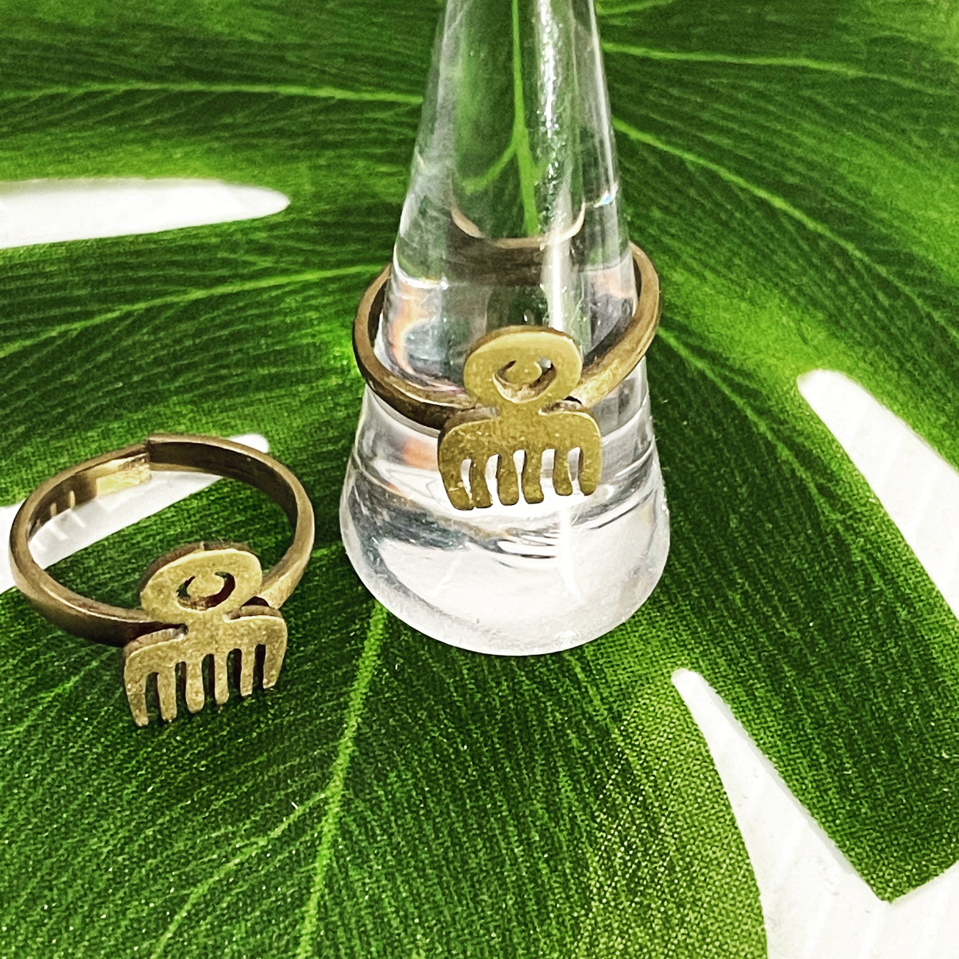 Hand carved Duafe adinkra symbol brass Africa shaped ring.