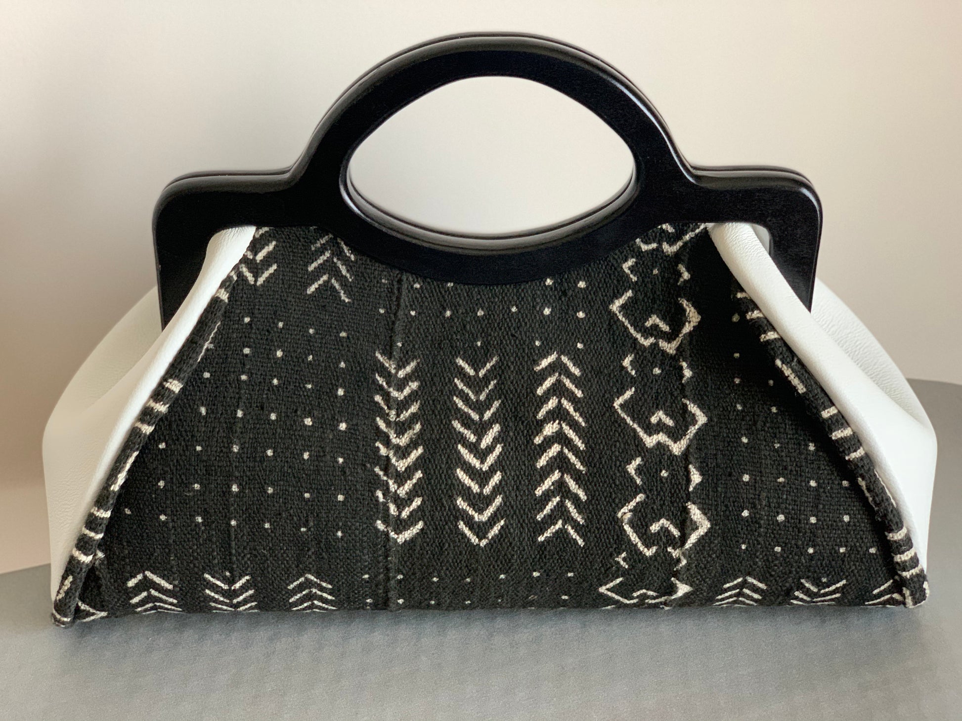This white leather bag is made from handwoven black kente fabrics woven in the Ashanti Region and the Volta