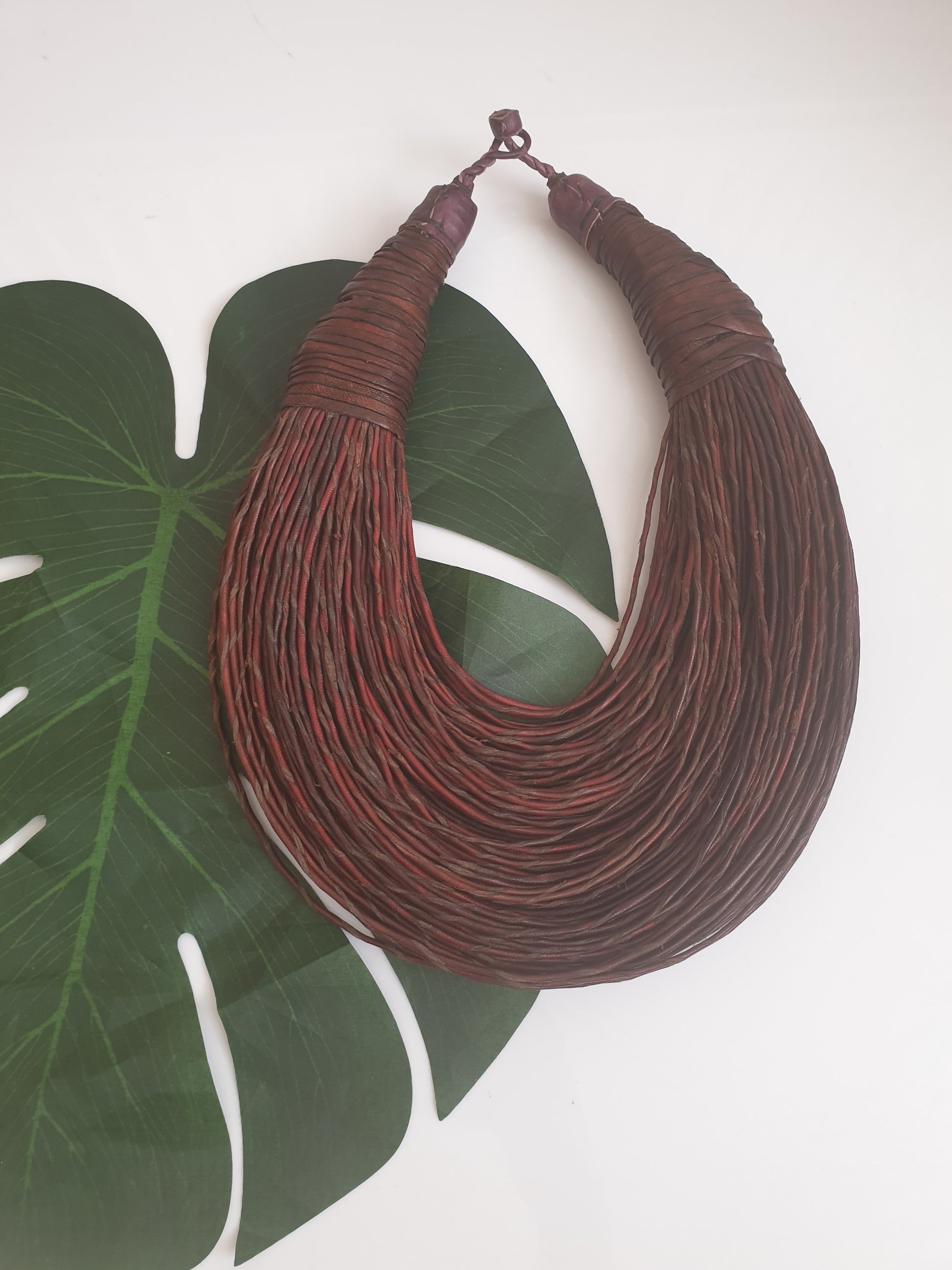 Brown leather layered statement necklace.