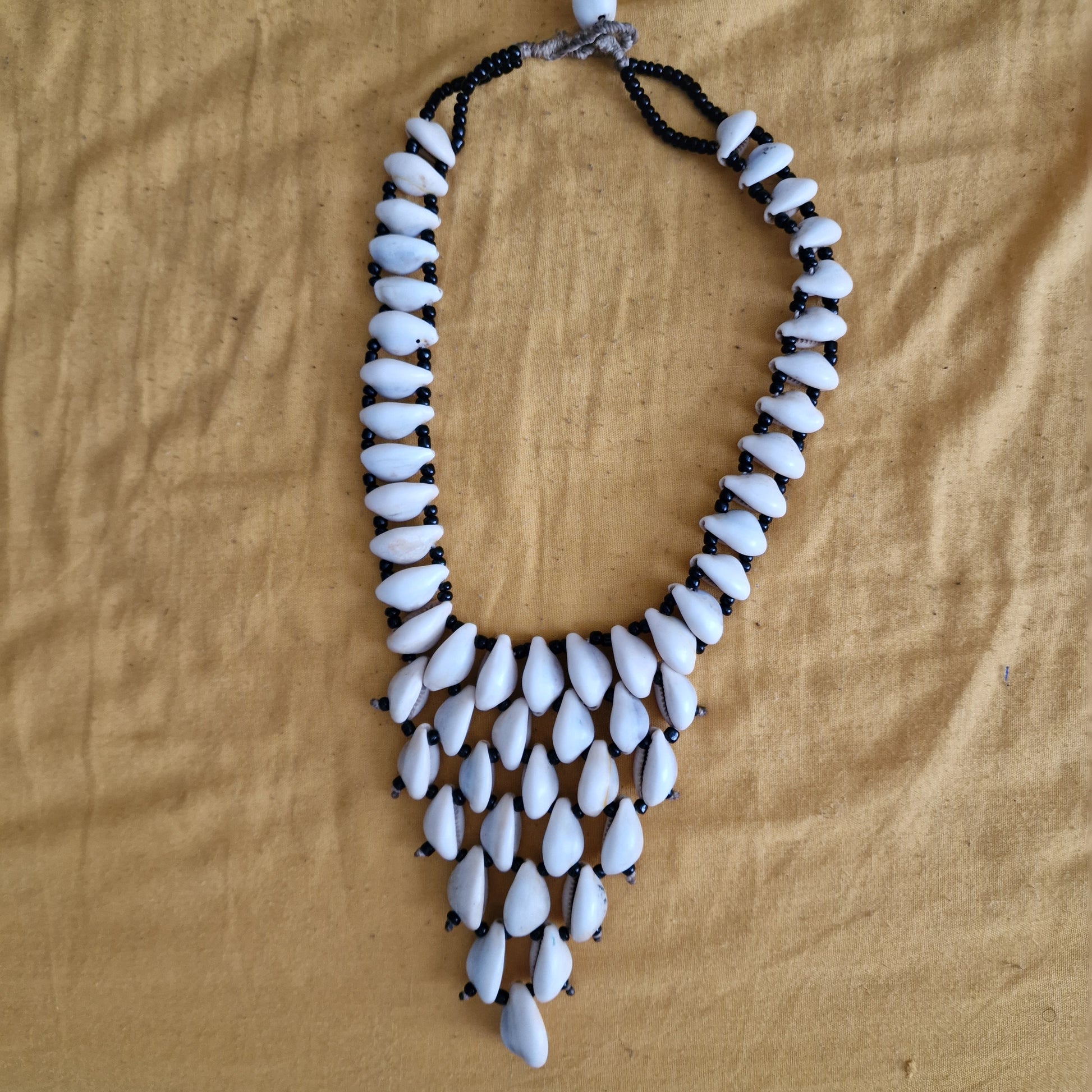 A 16 ins / 41 cm multi-drop necklace .. Cowrie Shells and 3 mm Black Glass spacer beads intricately laced together with a loop closing.