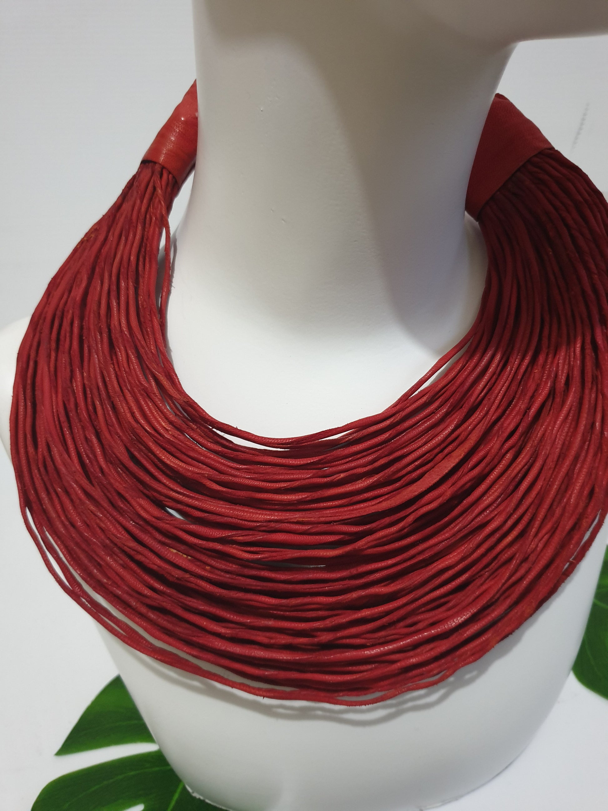 Red leather layered statement necklace